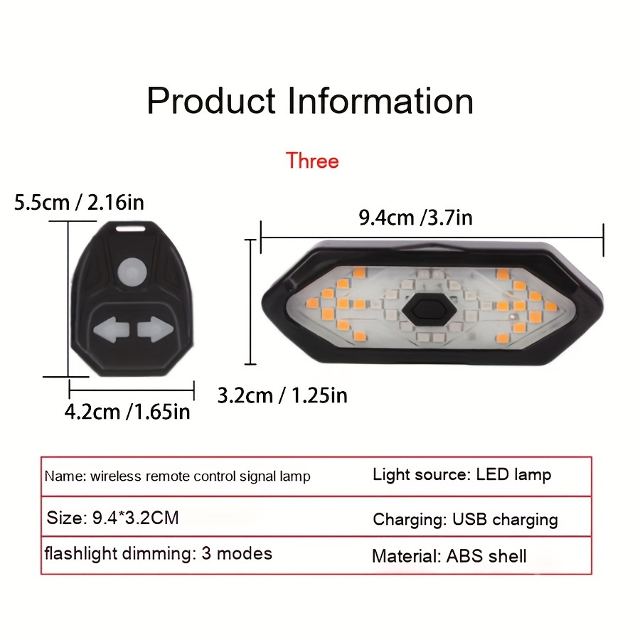 Highlighindividuals:1. Control 2 lighindividuals with 1 remote control.2. Designed with 120dB Alert speaker to provide better safety Alert when you turn left/right.Material: ABS+PCSize: about 94*32.5*26mm/3.7*1.3*1in132mm5.19inchColor: blaLight color: red, turns yellowLight beads: 32 LEDs (14 red light beads + 18 yellow light beads)Five light modes: red light - flaLower Legg red light - left turn signal - right turn signal - all flaLower LeggLight size: 94*32.5*26mm/3.7*1.3*1inControl type: remote contro
